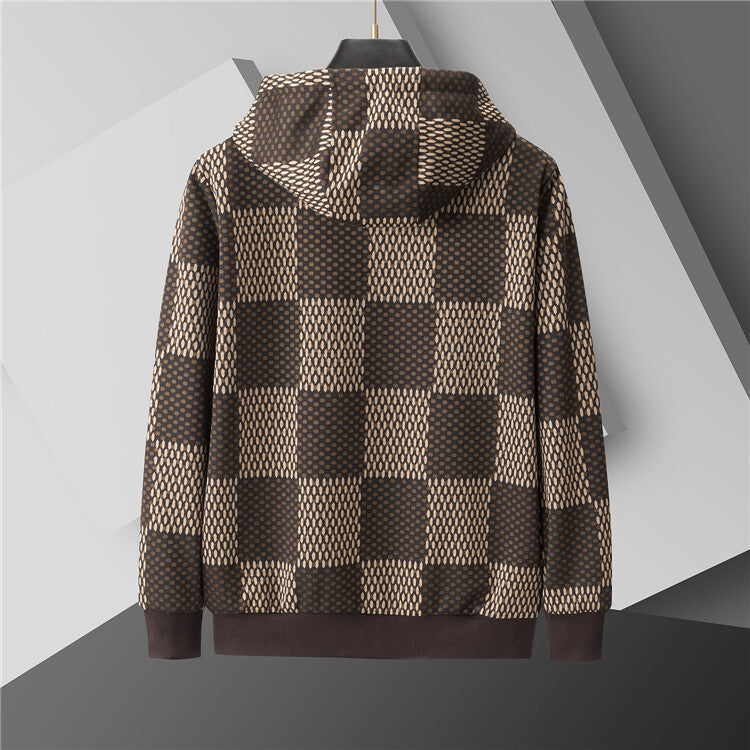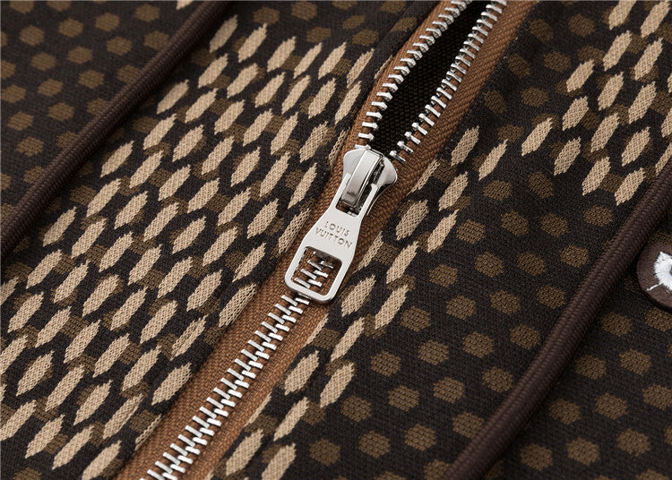 Two-piece matching set featuring a brown zip-up hoodie and coordinating drawstring joggers. Designed with an allover checkered-style pattern and decorative crystal patch accents. Comfortable fit suitable for casual or everyday wear.